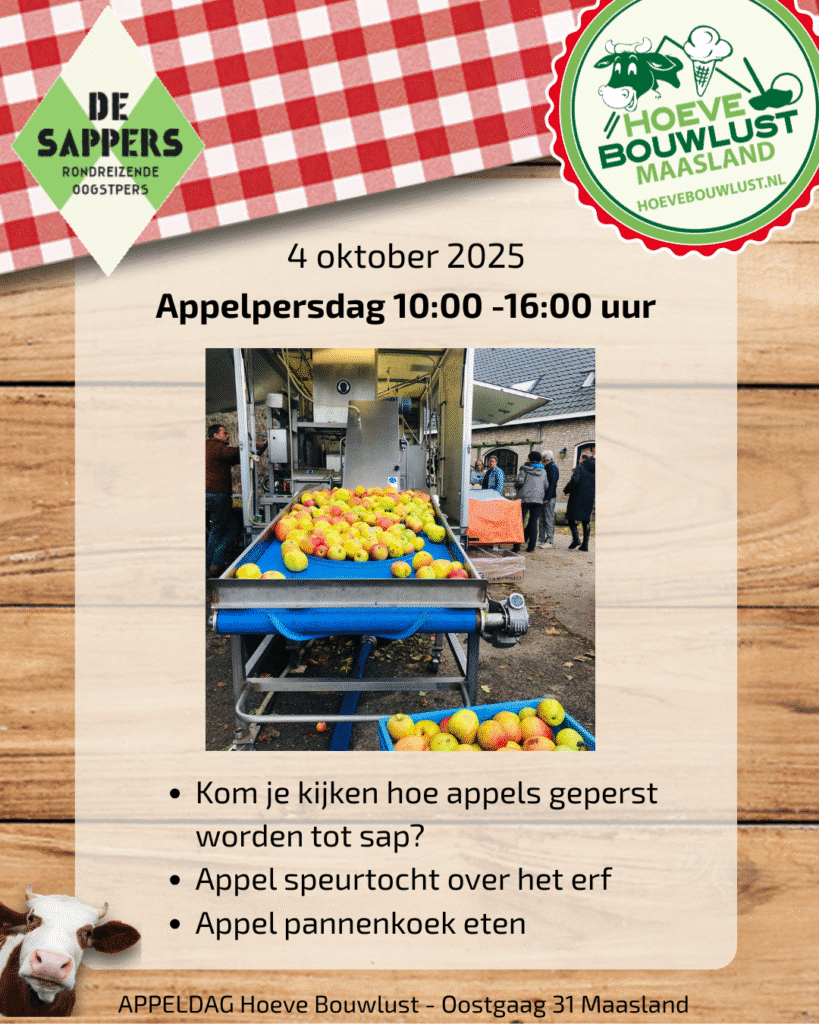 Zaterdag 4 oktober komen ‘De Sappers’ langs op de boerderij. Zij persen de oogst van particulieren en ondernemers tot heerlijke sap. Dit proces kun je helemaal volgen en met eigen ogen zien!